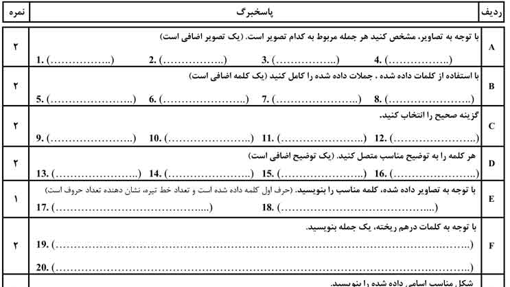 برای راحتی شما، پاسخبرگ سوالات نیز قرار داده شده تا بتوانید با سوالات و استایل سوالات امتحان نهایی نیز آشنا شوید. این نمونه سوالات برای دانش‌آموزان رشته‌های مختلف، معلمان زبان و افرادی که قصد طراحی آزمون دارند بسیار کاربردی است.